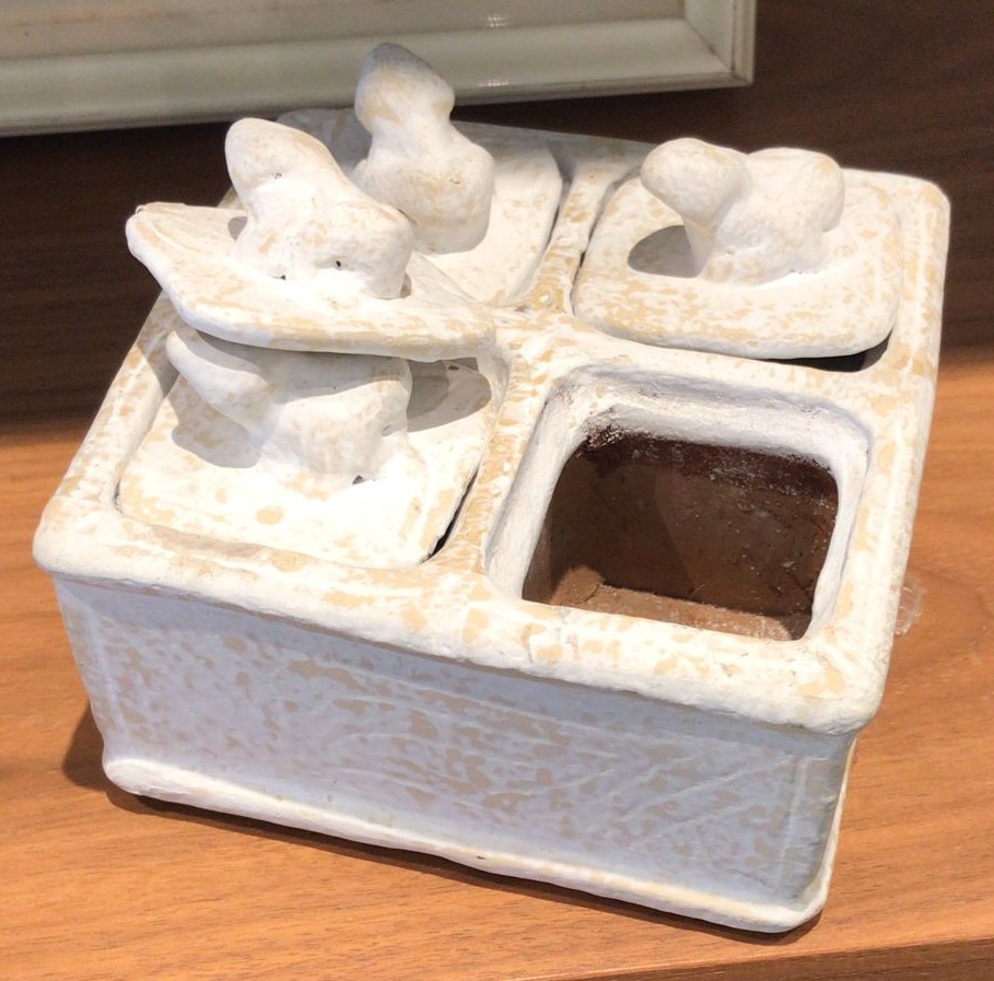Caja de barro con tapas de ranas. Dimensiones: 12x12x8cm de alto