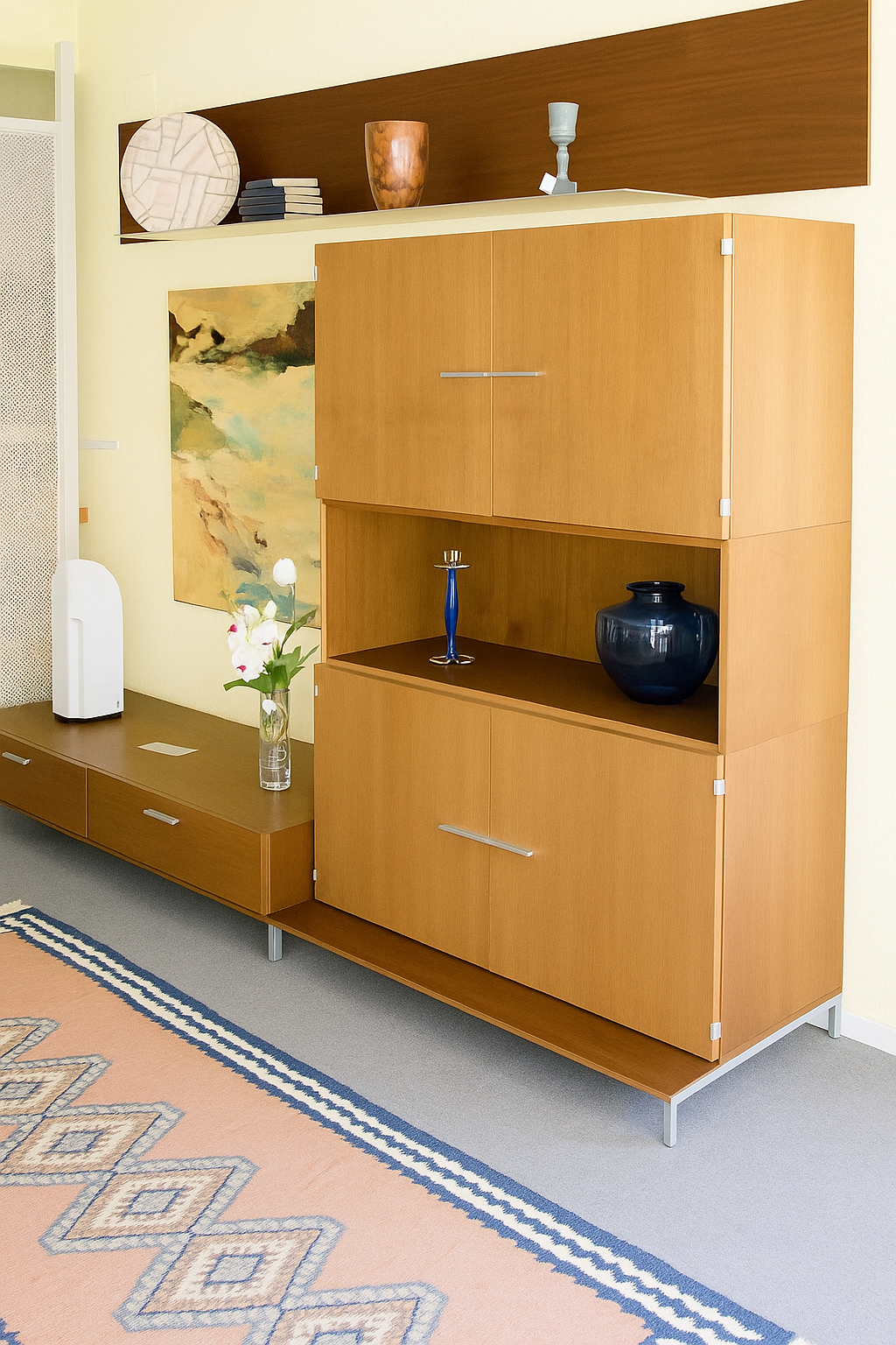Conjunto de tres elementos para salón, compuesto por un módulo con puertas y hueco decorativo, un módulo bajo con cajones y un panel con balda metálica de 0,8cm con alto soporte de peso. Acabado en roble teñido y la balda en acero mate. Fabricante Porro, Italia