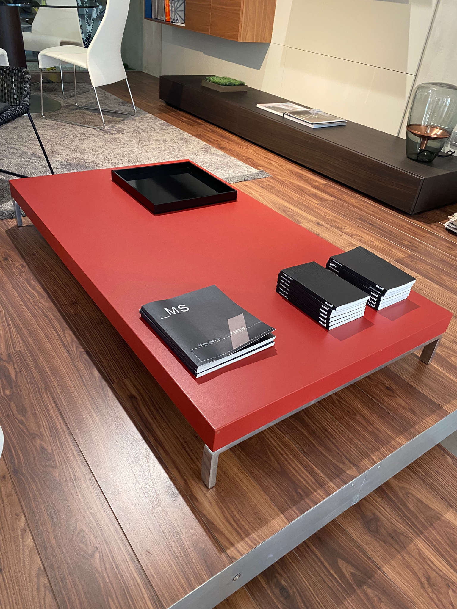 Mesa centro de gran formato. Acabado en laca granate rugoso con alta resistencia al rayado. Patas en acero inoxidable. Fabricante Zanotta, Italia. Dimensiones: 154x88x20