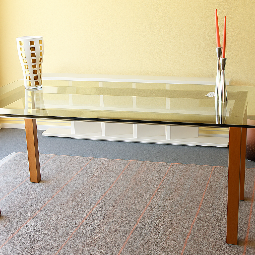 Mesa comedor con patas en madera maciza de cerezo y estructura de acero inoxidable macizo con sobre de cristal transparente de 15mm. Fabricante Zanotta, Italia. Dimensiones: 180×90